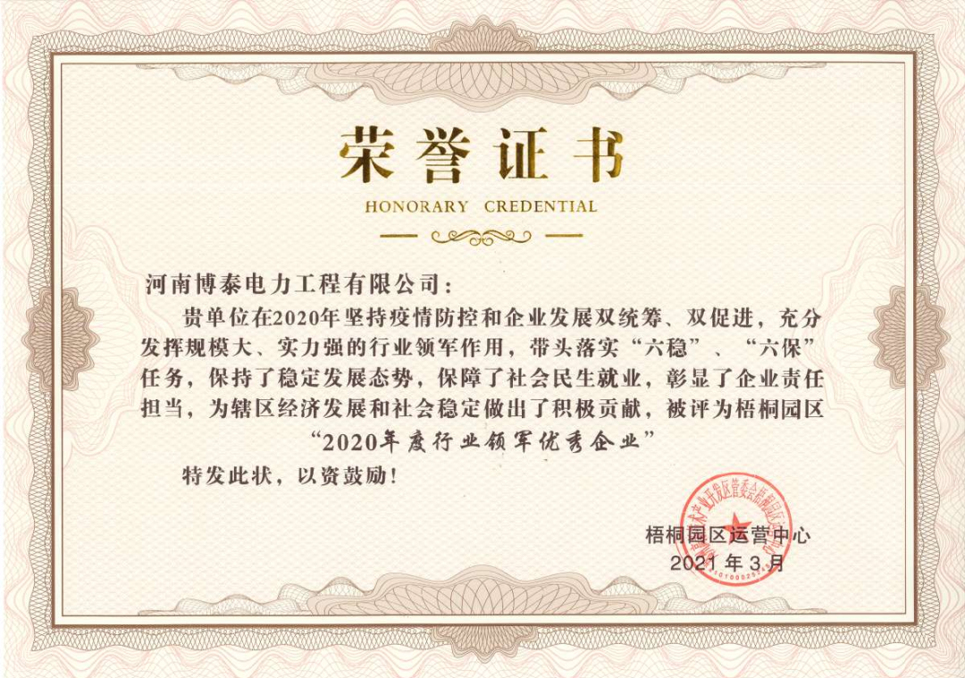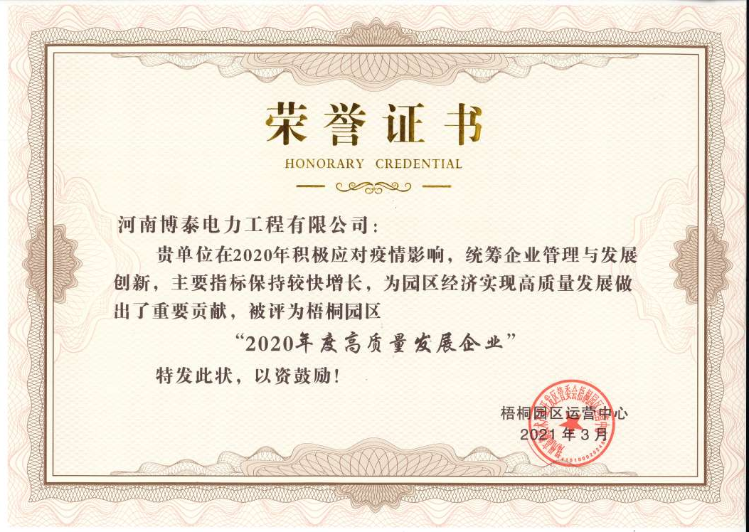 Postion: Home>>NEWS>>Company News > 喜报|恭贺博泰电力喜获“2020年高质量发展企业”“2020年度行业领军优秀企业”荣誉称号