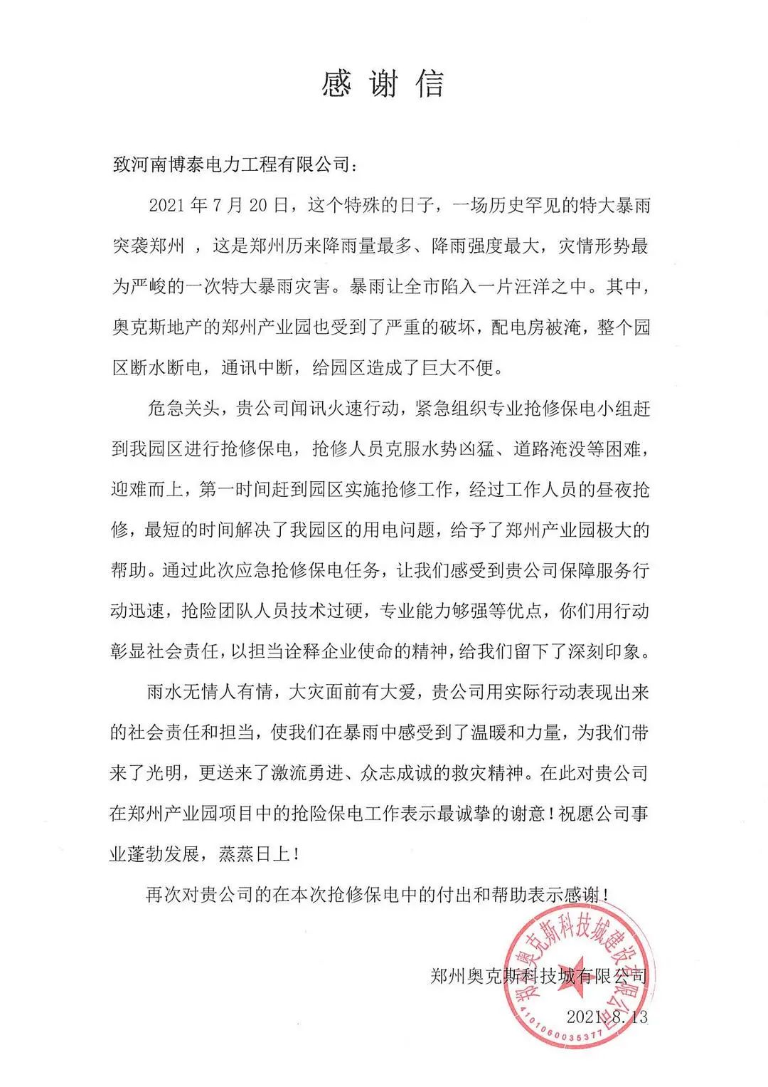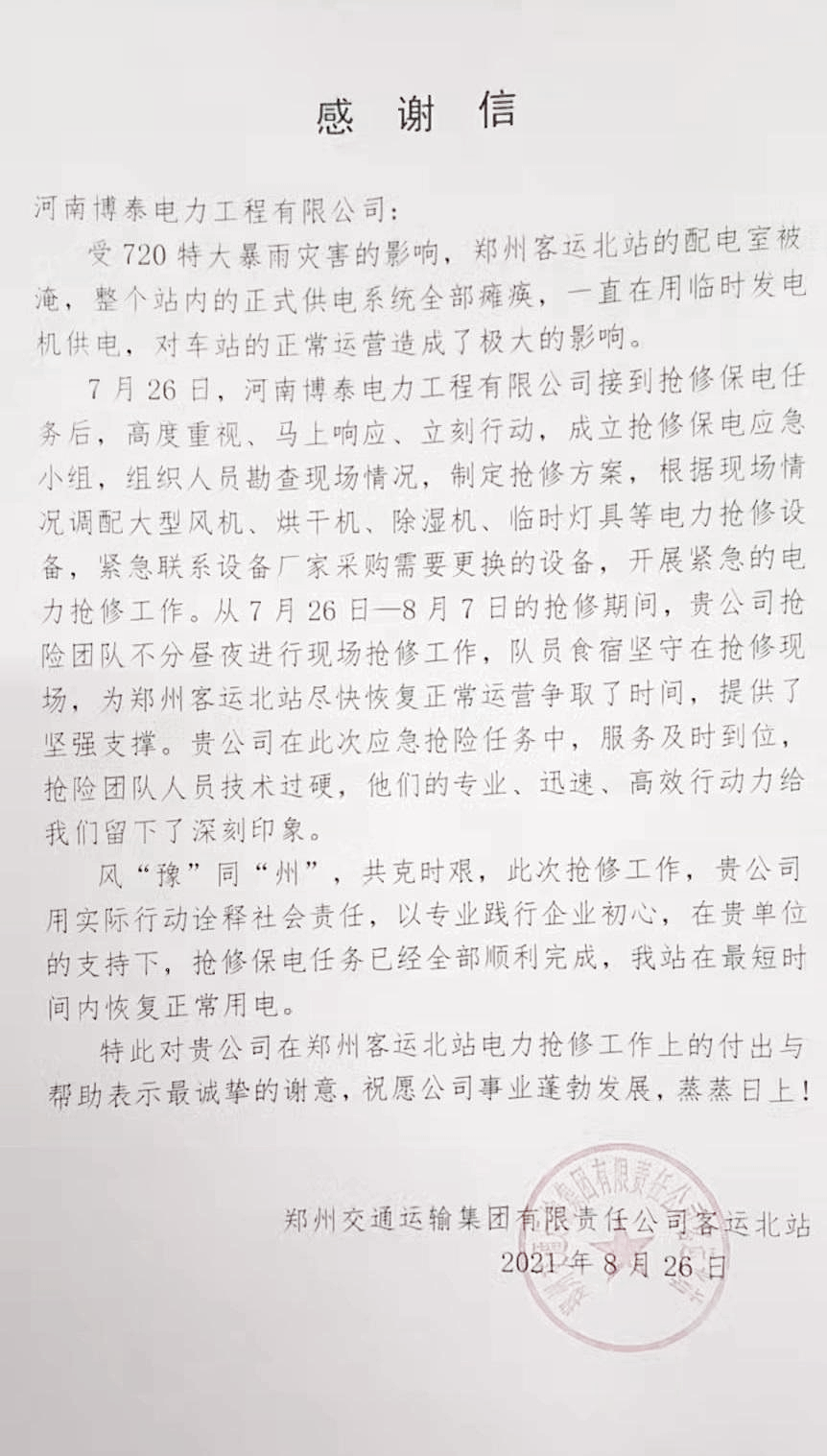 近日,博泰电力又收到了两封来自不同地方的感谢信,一封来自郑州奥克斯科技城建设有限公司,一封来自郑州客运北站,信中均对我公司在抗洪救灾工作中的鼎力相助表示感谢。