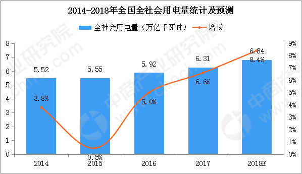数据来源:中商产业研究院大数据库2019年电力市场预测据初步统计数据显示,2018年全国日均发电量为184.68亿千瓦时,同比增长8.52%。其中,全社会用电量同比增速预计也将在8%以上,两者均有望创七年以来新高。具体来看,综合考虑国家政策、宏观经济运行态势、气温、电能替代、国际贸易环境、蓝天保卫战和环保安全检查等因素,预计2018年全年全社会用电量增速略高于8%,超过2017年增长水平。此外,预计全年全国新增发电装机容量1.2亿千瓦,其中,预计非化石能源发电装机投产8200万千瓦左右。全国发电装机容量达到19.0亿千瓦左右,其中,煤电装机容量10.1亿千瓦,非化石能源发电装机容量合计达到7.7亿千瓦,比重进一步提高至40%。2019年,预计我国全社会用电量将同比增长7%左右。其中,一季度受国内外环境错综复杂、经济下行压力较大,以及“暖冬”等影响,预计全国全社会用电量同比增长5%左右。更多资料请参考中商产业研究院发布的《2018-2023年中国电力市场前景及投资机会研究报告》,同时中商产业研究院还提供产业大数据、产业规划策划、产业园策划规划、产业招商引资等解决方案。